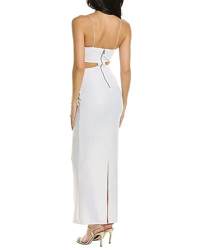 - Havana Cutout Maxi Dress in off-white with spaghetti straps, plunging neckline, cutout waist and center slit at back hem