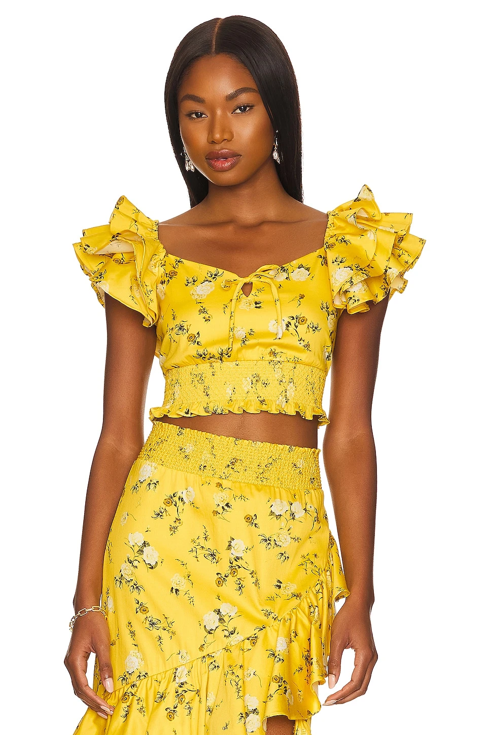 Alice + Olivia Shanae Ruffle Sleeve Tie Top Escape Ditsy Sunbeam